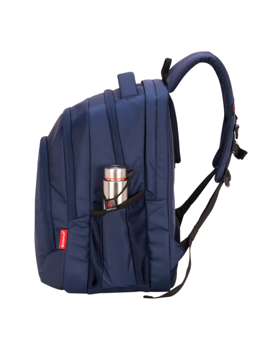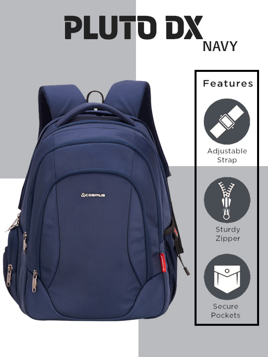 Cosmus Pluto DX 17 inches Laptop Backpack is ideal bag for regular traveller to carry Laptop along with couple of days trip essentials. Its well padded shoulder strap & thick padding on the back ease the burden of a full bag. It has 3 large compartments, which includes one detailed organizer compartment having inside zipper pocket & many organizer sections. Laptop compartment is well cushioned to protect your laptop, other main big zipper compartment to carry your books, files/folders and other essentials items. It also has 1 front easy access zipper pocket to keep pens headphone etc, this additional front easy access zipper pocket is very helpfull for quick access items on the go,2 mesh side pockets to carry water bottle and other easy access items. Bottle Lock attached to one of the side pocket protects your bottle from falling down in crowded places and while on riding bike.