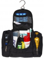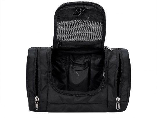A handy top hook allows for securely hanging the toiletry kit from a shower or towel rack, making it easy to view and access stored contents. The top hook tucks can be neatly placed inside the inner pocket when finished or when you would rather use the kit on a counter top.